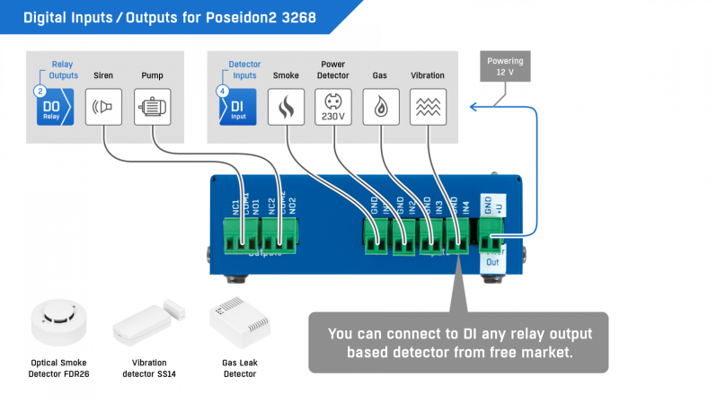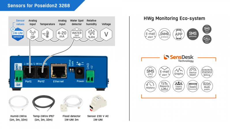 El Poseidon2 3268 monitorea sensores y controla E/S por la red. Almacena los valores medidos ( posee logger interno ) , envía alertas por alta temperatura ( emails y traps SNMP ). Posee 4 entradas de contacto seco y soporta hasta 8 sensores. Puede controlar 2 salidas de Relay. Soporta protocolos M2M , SNMP, Modbus/TCP, XML .