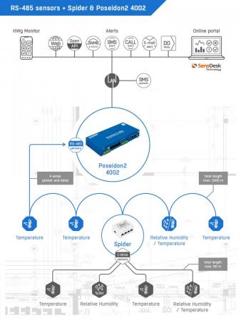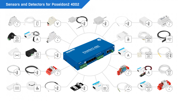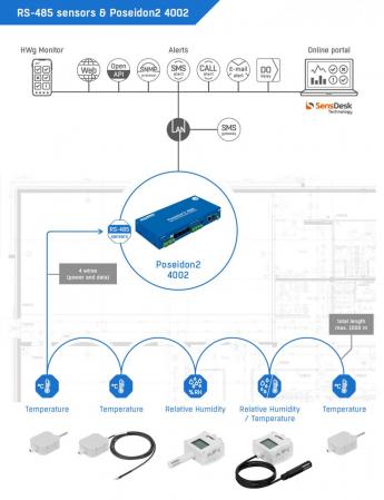 El Poseidon2 4002 es un equipo Rackeable de 1U que permite el monitoreo simultáneo de hasta 16 sensores de temperatura o humedad, aparte de sensores de Corriente, Tensión, Luz entre otras variables. Posee 12 entradas de contacto seco y 4 salidas de Relay. Envía alertas por email y traps SNMP y opcionalmente, con modem externo puede enviar alertas por SMS. El monitoreo se realiza accediendo a su webserver o por medio de SNMP.